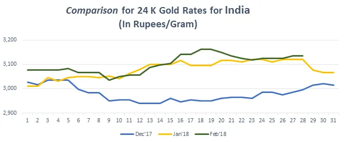 At the local shops in hyderabad for 22 karat gold the prices of the gold increased by 0 2 to stand at rs 27 220 and for 24 karats it rose to rs 29 694. Gold price history chart including last 1 year 5 years 10 years and 30 years history here you can see last 50 years of gold price history in india in 1950 the price of gold was around rs 100 per 10 gm of gold. Now it reaches to value of rs 32000 per 10 gm of gold gold prices touched a record high in 2013.